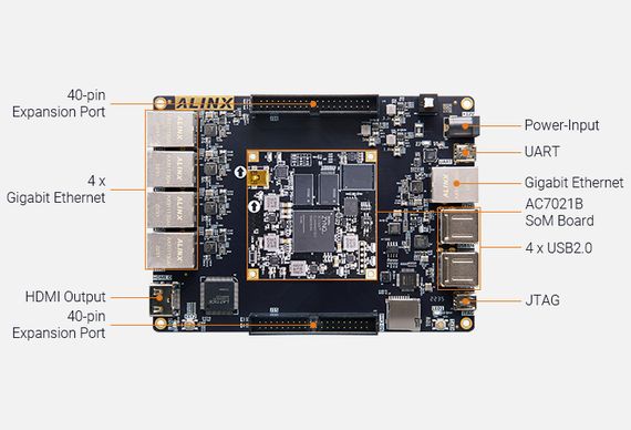 The AX7021 SoC development board equipped with the AMD Zynq 7000 SoC-series device with fast DDR3 SDRAM, eMMC Flash, QSPI Flash, Gigabit Ethernet, HDMI Out, suitable for Industrial, Medical, Video and Image Processing, Control & Instrumentation and Communication, etc.